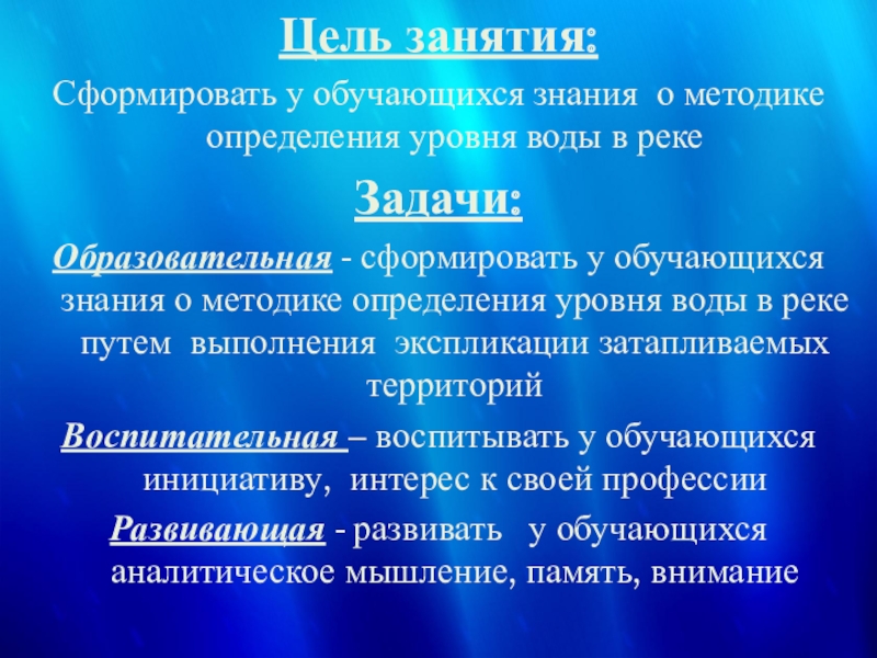 Образовательная - сформировать у обучающихся знания о методике определения уровня воды в реке путем выполнения экспликации затапливаемых территорий