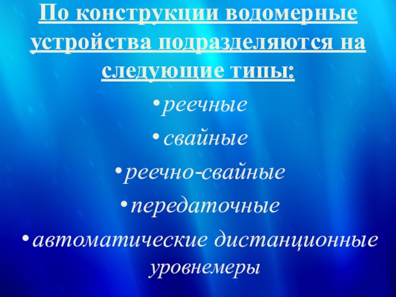 Слайд 8По конструкции водомерные устройства подразделяются на следующие типы: