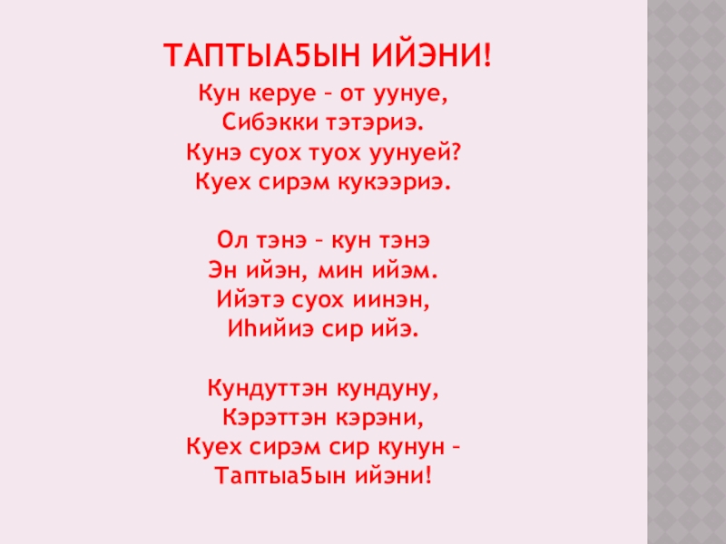 Таптыа5ын ийэни!Кун керуе – от уунуе,Сибэкки тэтэриэ.Кунэ суох туох уунуей?Куех сирэм кукээриэ.Ол тэнэ – кун тэнэЭн ийэн,