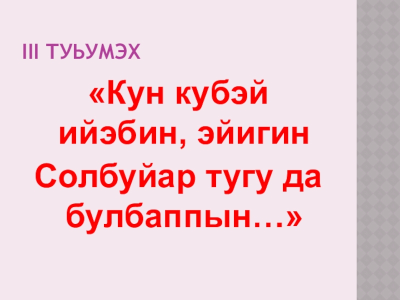 III туЬумэх«Кун кубэй ийэбин, эйигинСолбуйар тугу да булбаппын…»