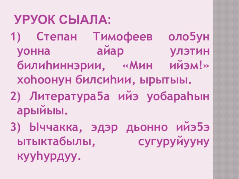 Уруок сыала:1) Степан Тимофеев оло5ун уонна айар улэтин билиhиннэрии, «Мин ийэм!» хоhоонун билсиhии, ырытыы.2) Литература5а ийэ уобараhын