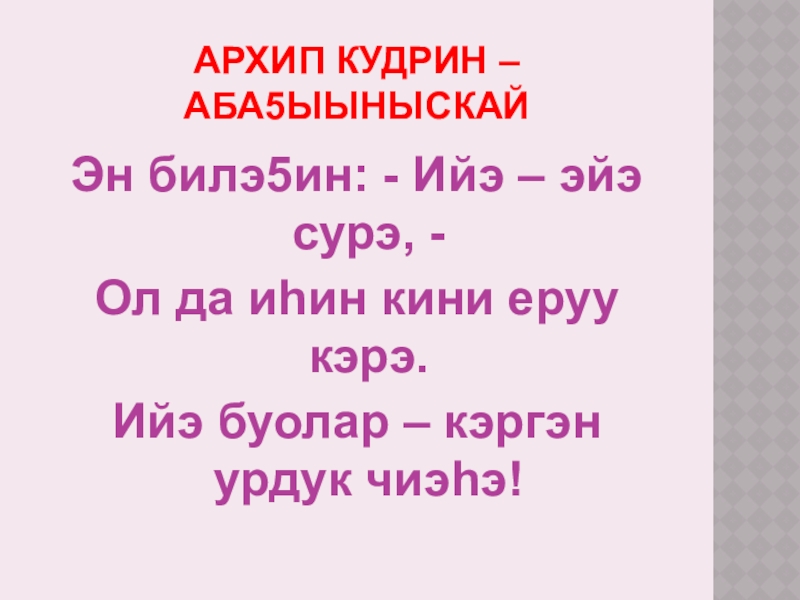 Архип Кудрин – Аба5ыыныскайЭн билэ5ин: - Ийэ – эйэ сурэ, - Ол да иhин кини еруу кэрэ.Ийэ