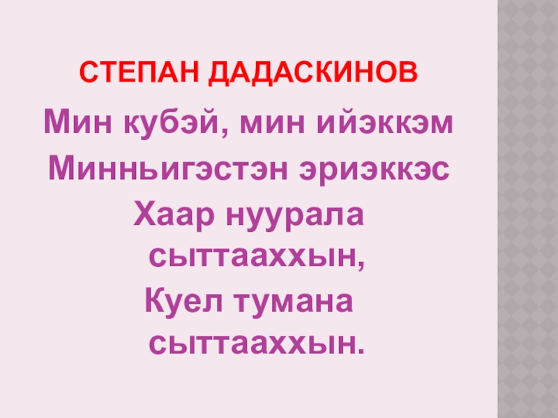 Степан Дадаскинов Мин кубэй, мин ийэккэмМинньигэстэн эриэккэсХаар нуурала сыттааххын,Куел тумана сыттааххын.