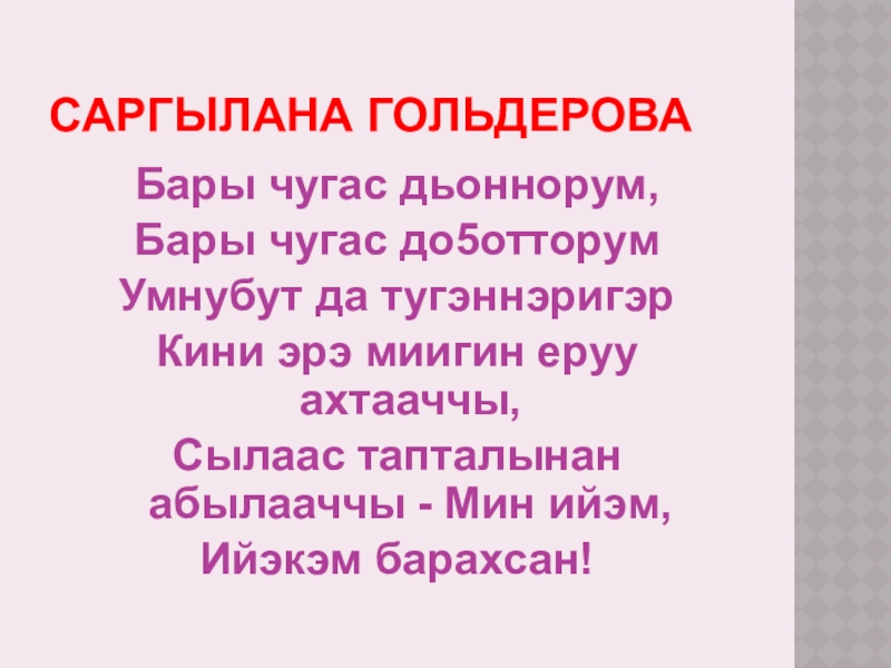 Саргылана ГольдероваБары чугас дьоннорум,Бары чугас до5отторумУмнубут да тугэннэригэрКини эрэ миигин еруу ахтааччы,Сылаас тапталынан абылааччы - Мин ийэм,