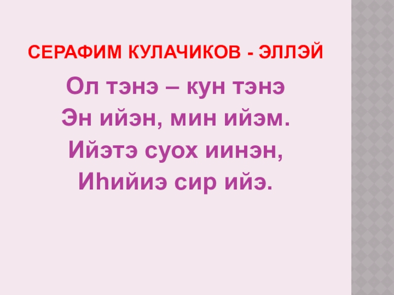 Серафим Кулачиков - ЭллэйОл тэнэ – кун тэнэЭн ийэн, мин ийэм.Ийэтэ суох иинэн,Иhийиэ сир ийэ.