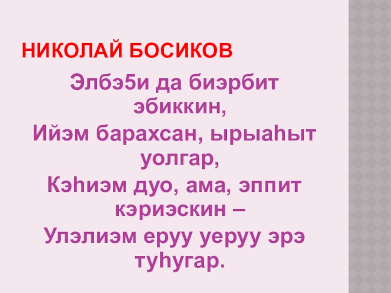 Николай БосиковЭлбэ5и да биэрбит эбиккин,Ийэм барахсан, ырыаhыт уолгар,Кэhиэм дуо, ама, эппит кэриэскин –Улэлиэм еруу уеруу эрэ туhугар.