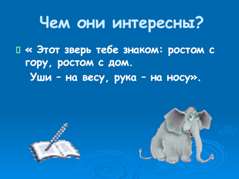 Чем они интересны?« Этот зверь тебе знаком: ростом с гору, ростом с дом.  Уши – на