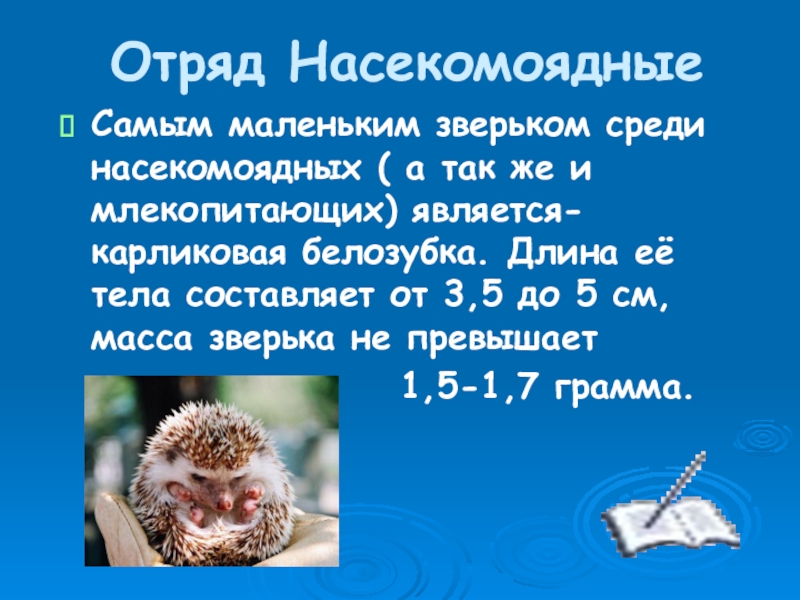 Отряд НасекомоядныеСамым маленьким зверьком среди насекомоядных ( а так же и млекопитающих) является- карликовая белозубка. Длина её тела составляет от 3,5 до 5 см, масса зверька не превышает