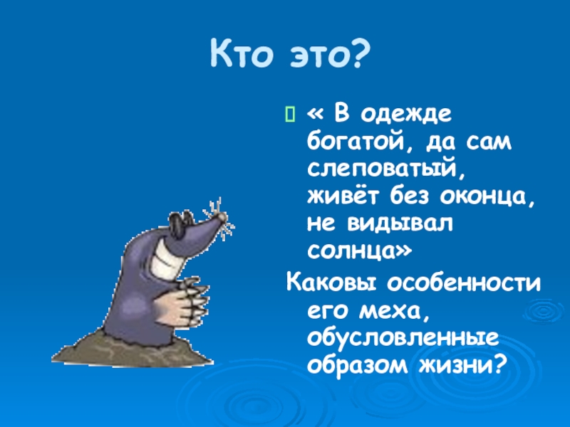 Кто это?« В одежде богатой, да сам слеповатый, живёт без оконца, не видывал солнца»Каковы особенности его меха,