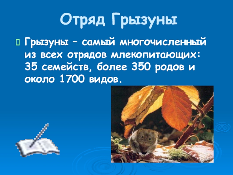 Отряд ГрызуныГрызуны – самый многочисленный из всех отрядов млекопитающих: 35 семейств, более 350 родов и около 1700
