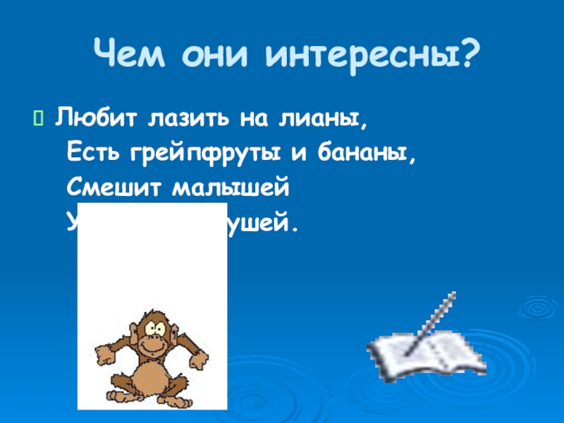 Чем они интересны?Любит лазить на лианы,  Есть грейпфруты и бананы,  Смешит малышей  Улыбкой до
