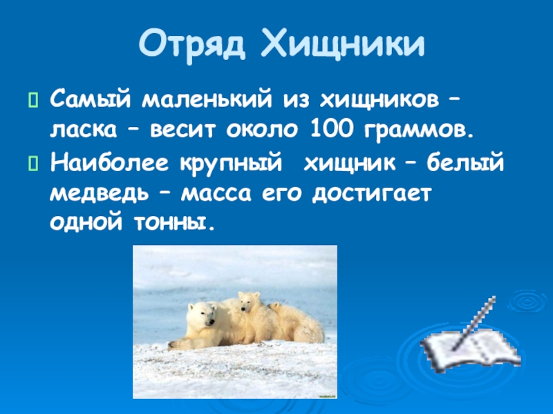 Отряд ХищникиСамый маленький из хищников – ласка – весит около 100 граммов.Наиболее крупный хищник – белый медведь