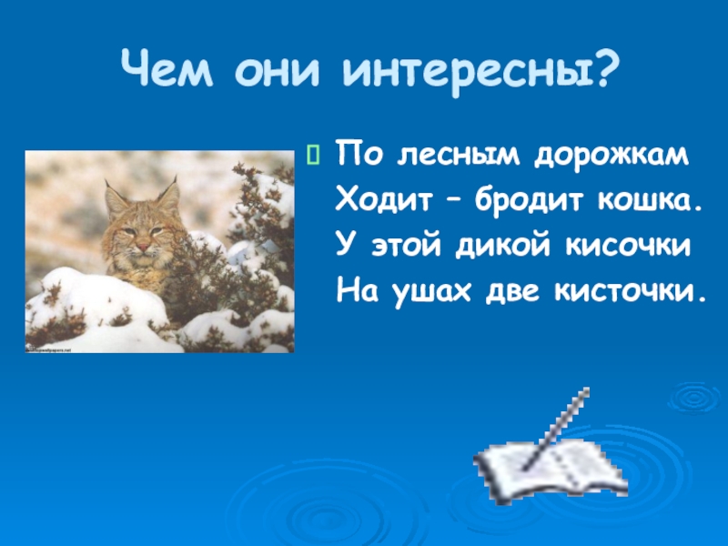 Чем они интересны?По лесным дорожкам Ходит – бродит кошка. У этой дикой кисочки На ушах две кисточки.