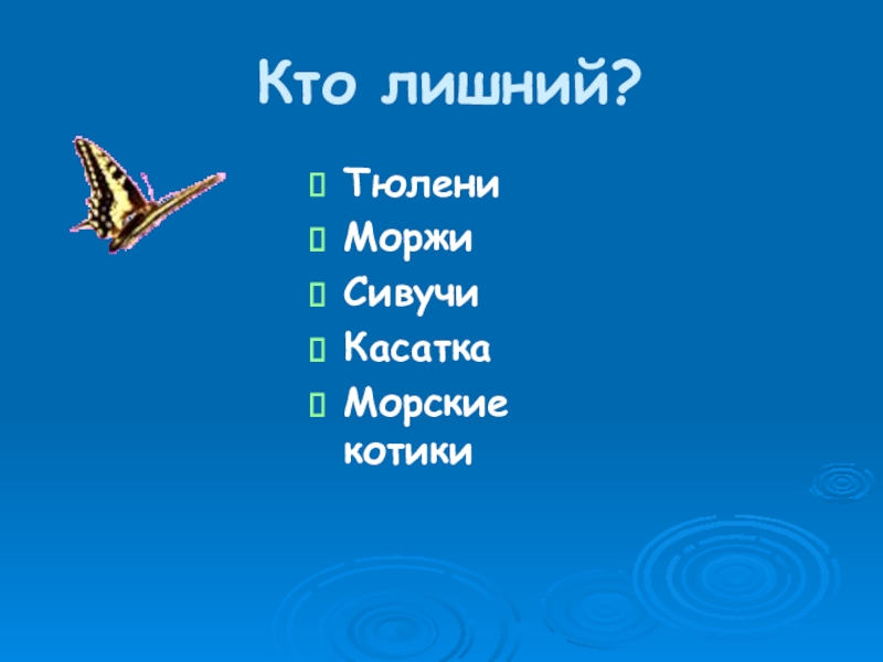 Кто лишний?ТюлениМоржиСивучиКасаткаМорские котики