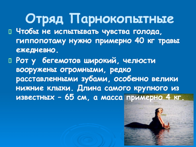 Отряд ПарнокопытныеЧтобы не испытывать чувства голода, гиппопотаму нужно примерно 40 кг травы ежедневно.Рот у бегемотов широкий, челюсти