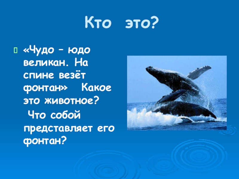 Кто это?«Чудо – юдо великан. На спине везёт фонтан»  Какое это животное?  Что собой представляет