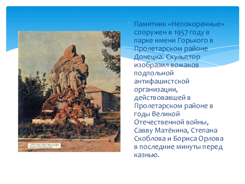 Слайд 2Памятник «Непокоренные» сооружен в 1957 году в парке имени Горького в