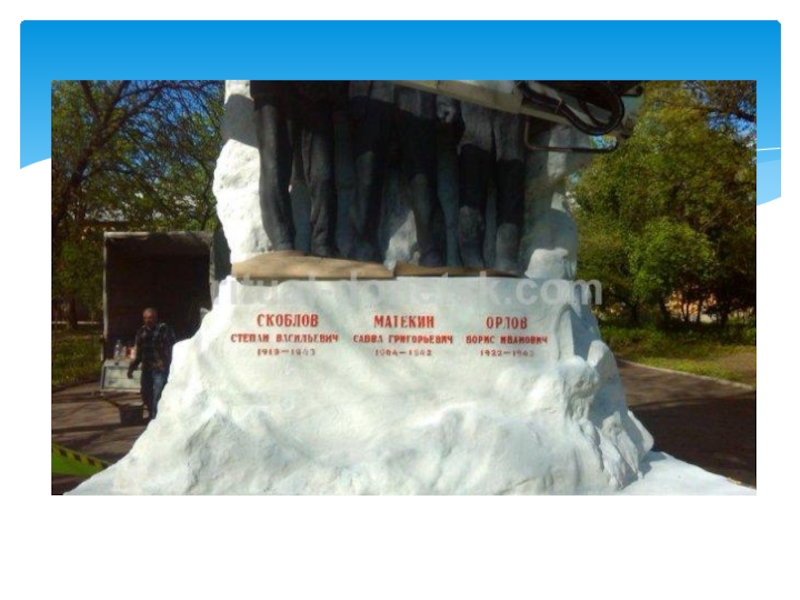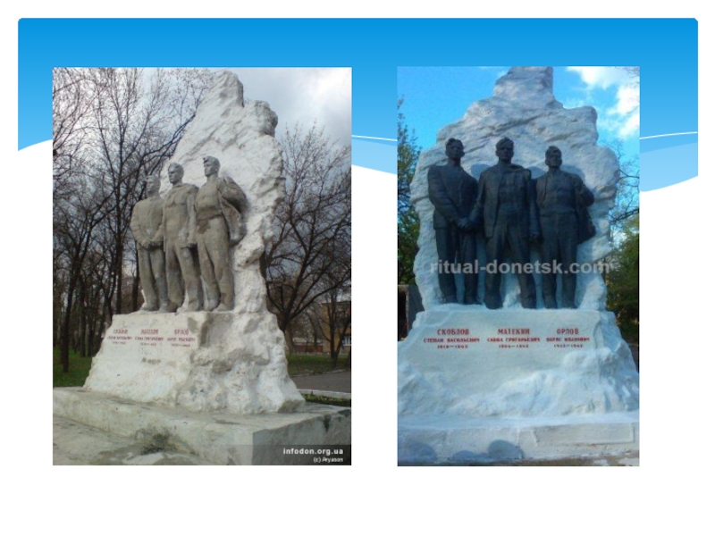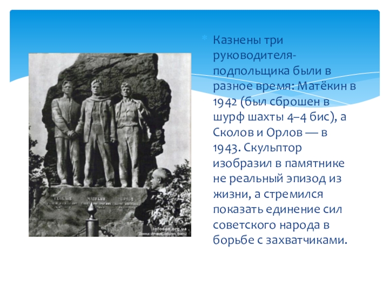 сброшен в шурф шахты 4–4 бис), а Сколов и Орлов — в 1943. Скульптор изобразил в памятнике не реальный эпизод из жизни, а стремился показать единение сил советского народа в борьбе с захватчиками.