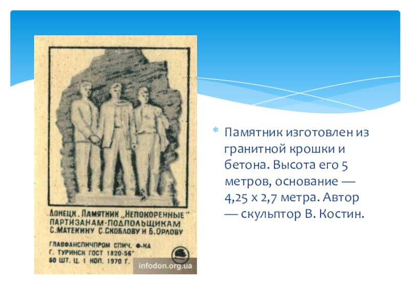 Слайд 4Памятник изготовлен из гранитной крошки и бетона. Высота его 5 метров,