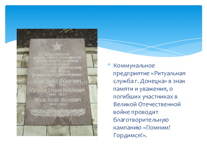 Слайд 8Коммунальное предприятие «Ритуальная служба г. Донецка» в знак памяти и уважения,