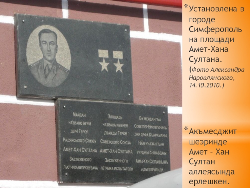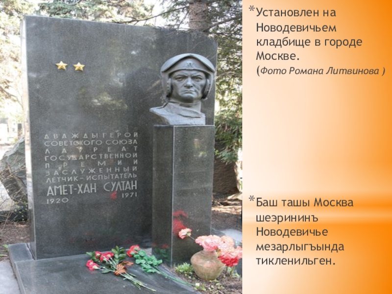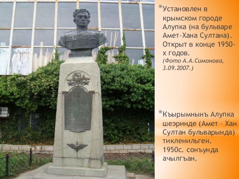 Слайд 1Памятники дважды герою советского союза АМЕТ – ХАНУ СУЛТАНУ