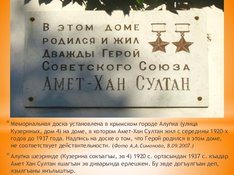 на доме, в котором Амет-Хан Султан жил с середины 1920-х годов до 1937 года. Надпись на доске о том, что Герой родился в этом доме, не соответствует действительности. (Фото А.А.Симонова, 8.09.2007.)