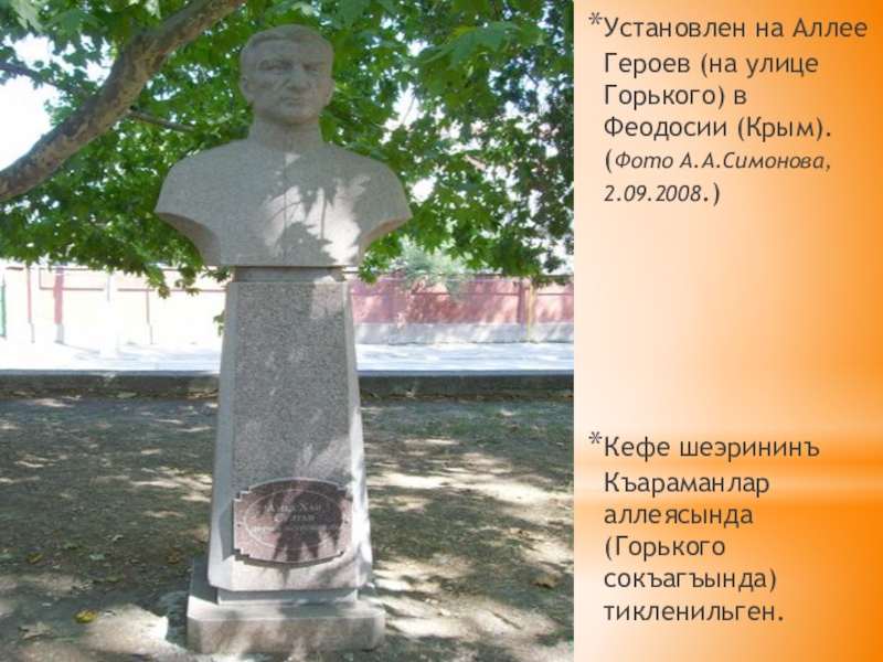 Установлен на Аллее Героев (на улице Горького) в Феодосии (Крым). (Фото А.А.Симонова, 2.09.2008.)Кефе шеэрининъ Къараманлар аллеясында (Горького