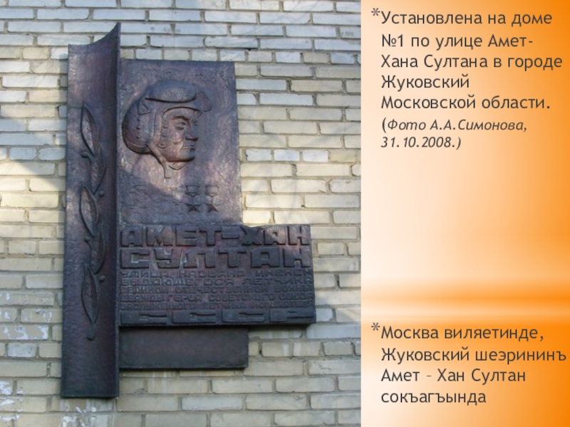 Установлена на доме №1 по улице Амет-Хана Султана в городе Жуковский Московской области. (Фото А.А.Симонова, 31.10.2008.)Москва виляетинде,