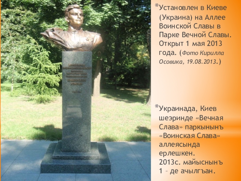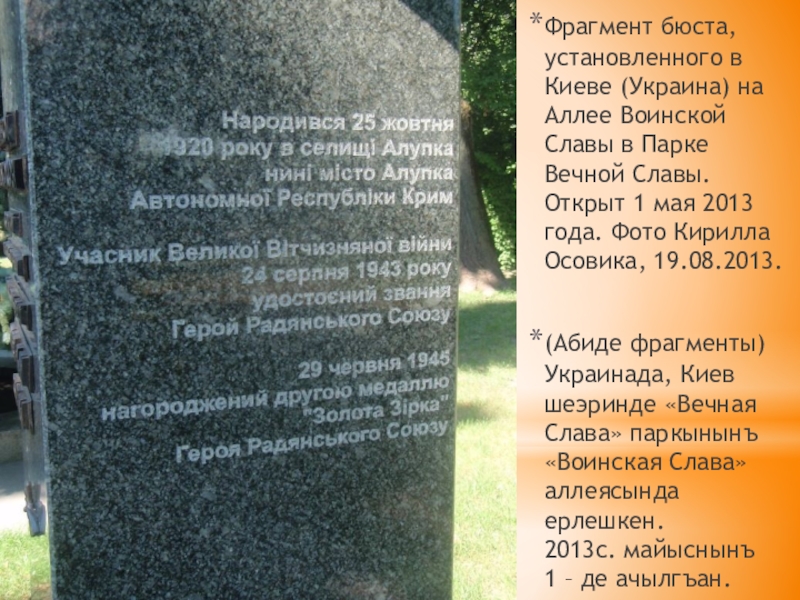 Слайд 12Фрагмент бюста, установленного в Киеве (Украина) на Аллее Воинской Славы в