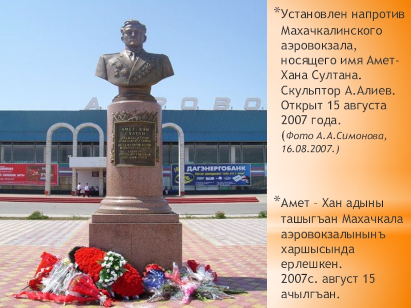 Слайд 4Установлен напротив Махачкалинского аэровокзала, носящего имя Амет-Хана Султана. Скульптор А.Алиев. Открыт