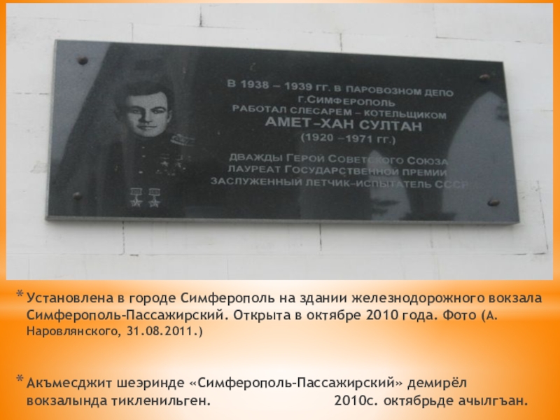 Установлена в городе Симферополь на здании железнодорожного вокзала Симферополь-Пассажирский. Открыта в октябре 2010 года. Фото (А.Наровлянского, 31.08.2011.)Акъмесджит