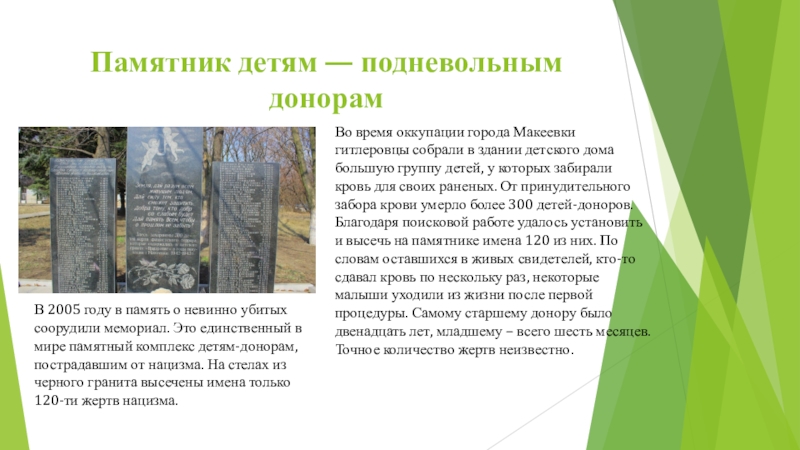 В 2005 году в память о невинно убитых соорудили мемориал. Это единственный в мире памятный комплекс детям-донорам, пострадавшим от нацизма. На стелах из черного гранита высечены имена только 120-ти жертв нацизма.