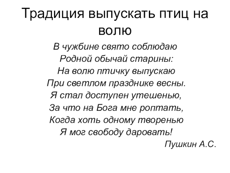 Традиция выпускать птиц на волюВ чужбине свято соблюдаю Родной обычай старины: На волю птичку выпускаю При светлом