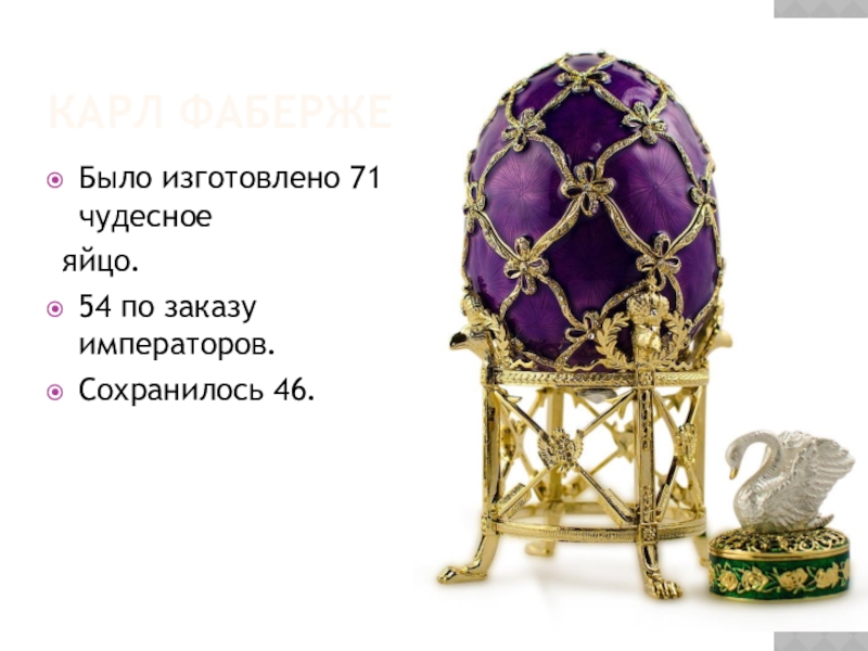 КАРЛ ФАБЕРЖЕБыло изготовлено 71 чудесное яйцо.54 по заказу императоров.Сохранилось 46.