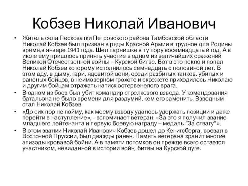 В этом звании Николай Иванович Кобзев дошел до Кенигсберга, воевал в Восточной Пруссии, был дважды ранен. Память ветерана хранит многие эпизоды кровавой бойни. А в памяти потомков он прежде всего остается участником, невиданной в истории войн, битвы на Курской дуге.