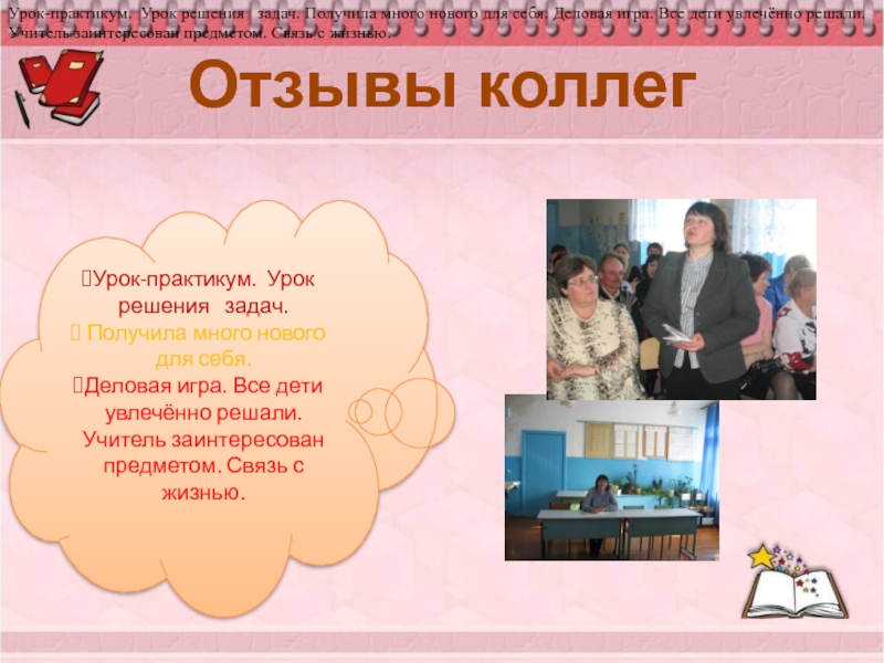 Урок-практикум. Урок решения задач. Получила много нового для себя. Деловая игра. Все дети увлечённо решали. Учитель заинтересован предметом. Связь с жизнью.
