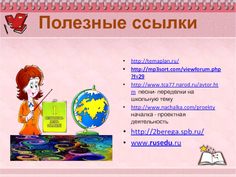 Это сайт презентаций, где можно хранить и обмениваться своими презентациями, докладами, проектами, шаблонами в формате PowerPoint с другими пользователями. Мы помогаем школьникам, студентам, учителям, преподавателям хранить и обмениваться учебными материалами.