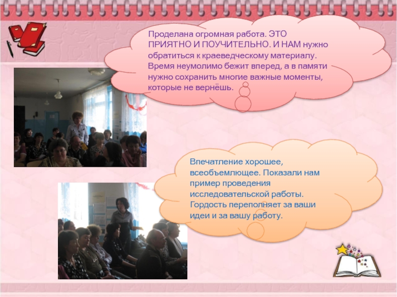 Впечатление хорошее, всеобъемлющее. Показали нам пример проведения исследовательской работы. Гордость переполняет за ваши идеи и за вашу работу.