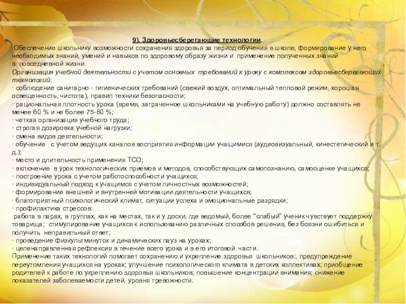 Организация учебной деятельности с учетом основных требований к уроку с комплексом здоровьесберегающих технологий: