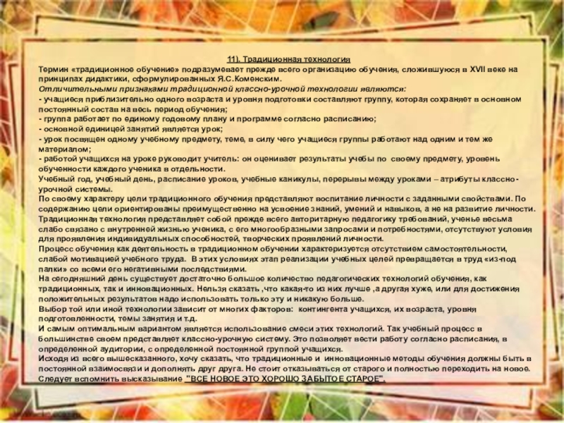 На сегодняшний день существует достаточно большое количество педагогических технологий обучения, как традиционных, так и инновационных. Нельзя сказать ,что какая-то из них лучше ,а другая хуже, или для достижения положительных результатов надо использовать только эту и никакую больше.