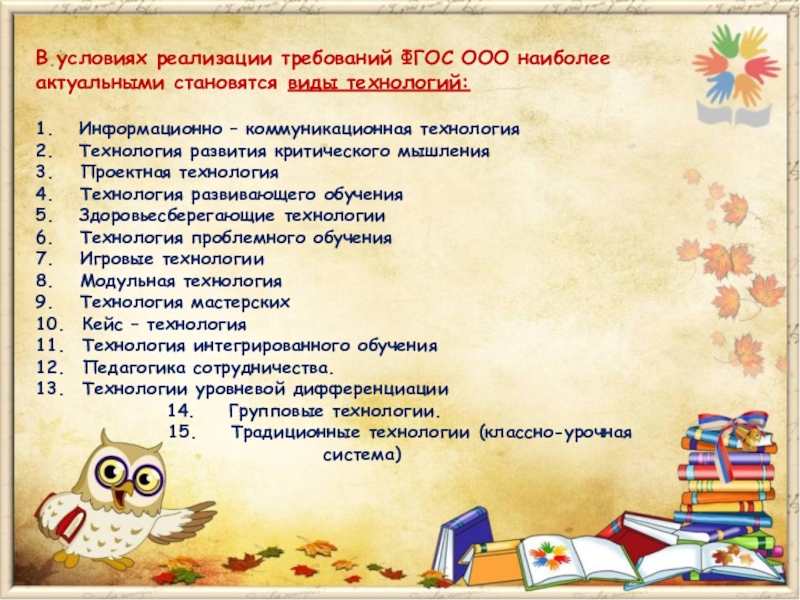Слайд 4В условиях реализации требований ФГОС ООО наиболее актуальными становятся виды технологий: