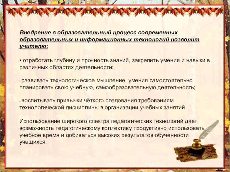 Внедрение в образовательный процесс современных образовательных и информационных технологий позволит учителю: