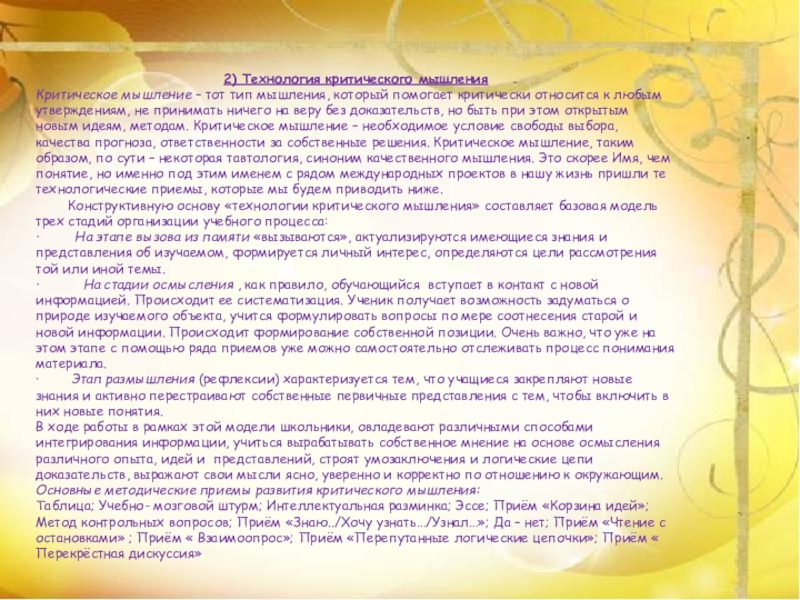 Таблица; Учебно- мозговой штурм; Интеллектуальная разминка; Эссе; Приём «Корзина идей»; Метод контрольных вопросов; Приём «Знаю../Хочу узнать…/Узнал…»; Да – нет; Приём «Чтение с остановками» ; Приём « Взаимоопрос»; Приём «Перепутанные логические цепочки»; Приём « Перекрёстная дискуссия»