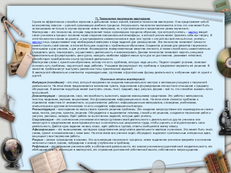 знаний, является технология мастерских. Она представляет собой альтернативу классно – урочной организации учебного процесса. Актуальность технологии заключаются в том, что она может быть использована не только в случае изучения нового материала, но и при повторении и закреплении ранее изученного.