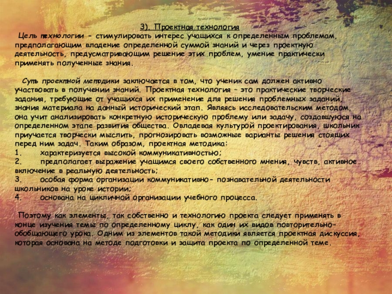 Суть проектной методики заключается в том, что ученик сам должен активно участвовать в получении знаний. Проектная технология – это практические творческие задания, требующие от учащихся их применение для решения проблемных заданий, знания материала на данный исторический этап. Являясь исследовательским методом, она учит анализировать конкретную историческую проблему или задачу, создавшуюся на определенном этапе развития общества. Овладевая культурой проектирования, школьник приучается творчески мыслить, прогнозировать возможные варианты решения стоящих перед ним задач. Таким образом, проектная методика: