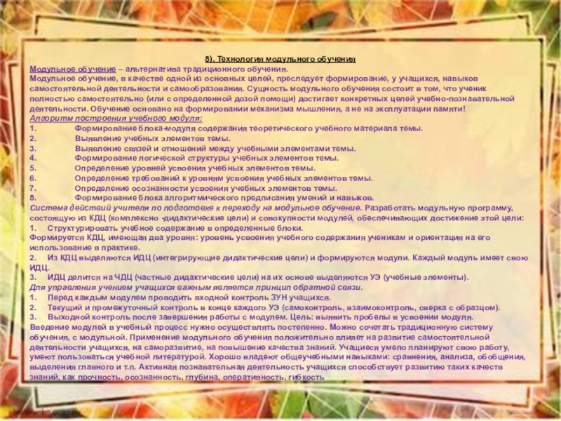 качестве одной из основных целей, преследует формирование, у учащихся, навыков самостоятельной деятельности и самообразования. Сущность модульного обучения состоит в том, что ученик полностью самостоятельно (или с определенной дозой помощи) достигает конкретных целей учебно-познавательной деятельности. Обучение основано на формировании механизма мышления, а не на эксплуатации памяти!