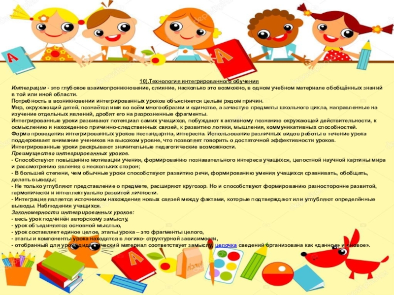 Форма проведения интегрированных уроков нестандартна, интересна. Использование различных видов работы в течение урока поддерживает внимание учеников на высоком уровне, что позволяет говорить о достаточной эффективности уроков. Интегрированные уроки раскрывают значительные педагогические возможности.