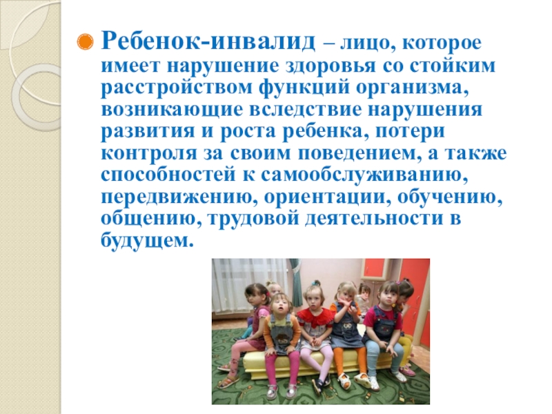 Слайд 5Ребенок-инвалид – лицо, которое имеет нарушение здоровья со стойким расстройством функций
