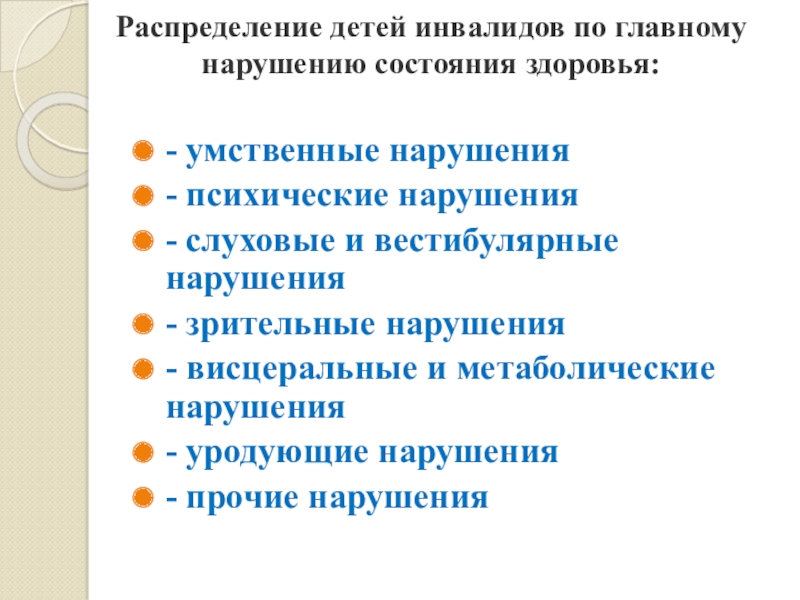 Слайд 8Распределение детей инвалидов по главному нарушению состояния здоровья: