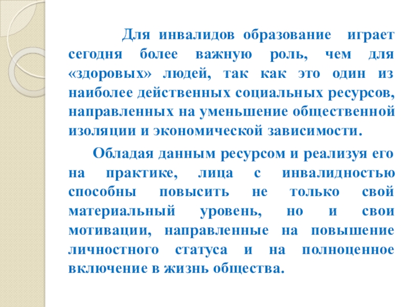 важную роль, чем для «здоровых» людей, так как это один из наиболее действенных социальных ресурсов, направленных на уменьшение общественной изоляции и экономической зависимости.